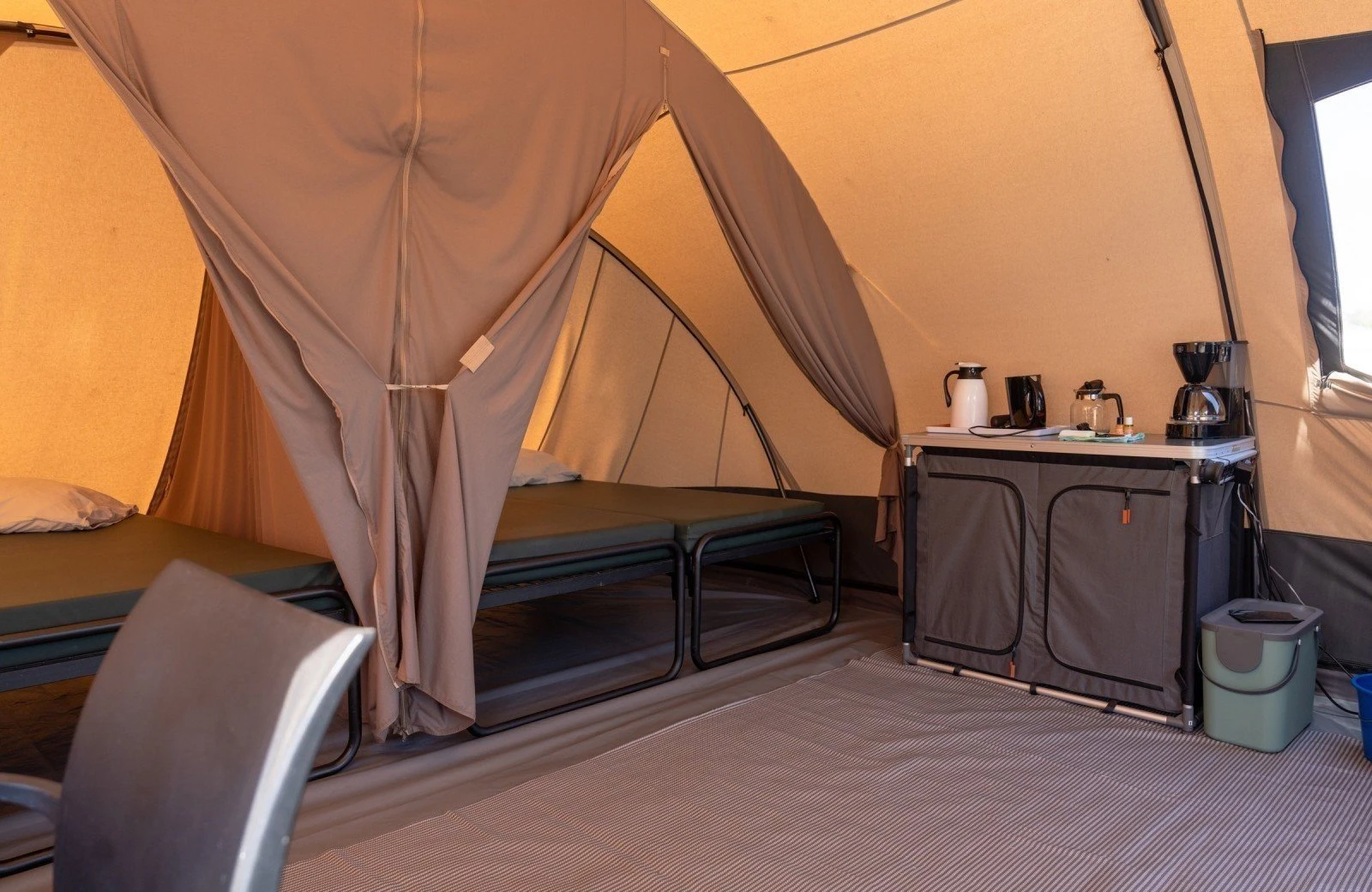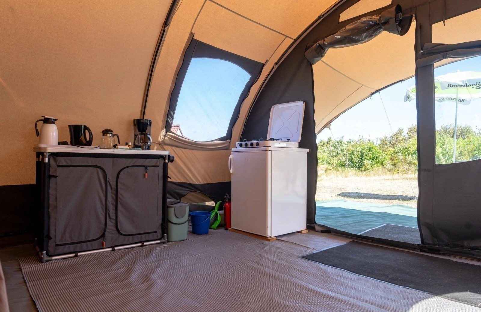 -In de tent is een kookplaat aanwezig en keukeninventaris, waterkoker, koffiezetapparaat en koelkast.