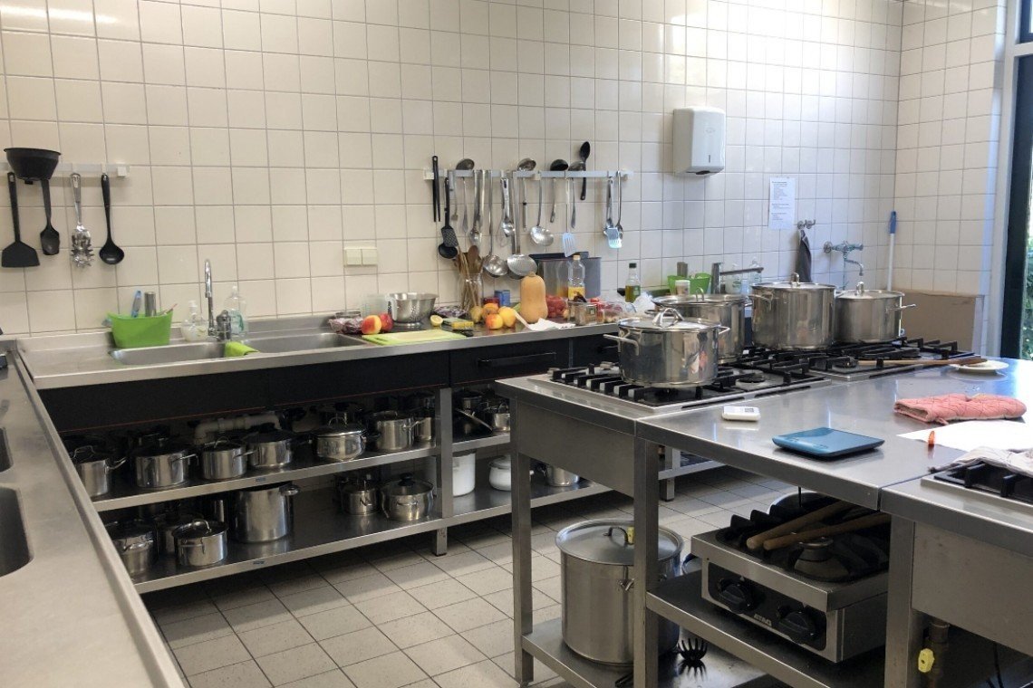 Een grote gezamenlijke keuken van alle gemakken voorzien, je moet zelf voor eten en drinken zorgen.