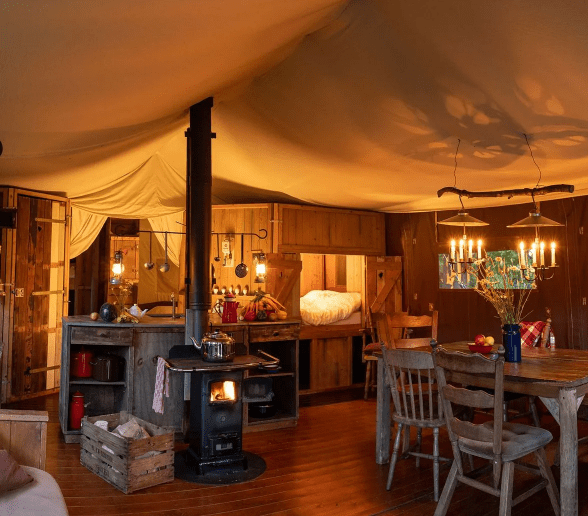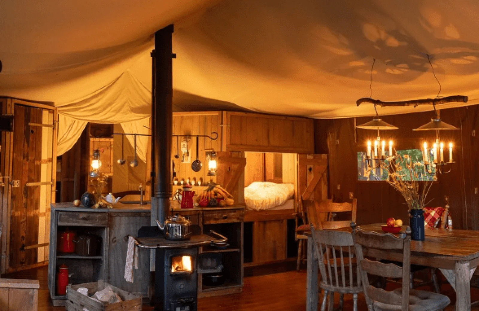 - De tent: Nostalgische inrichting met bedstee en houtkachel om te koken