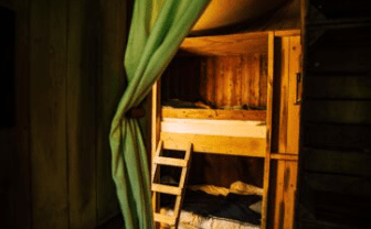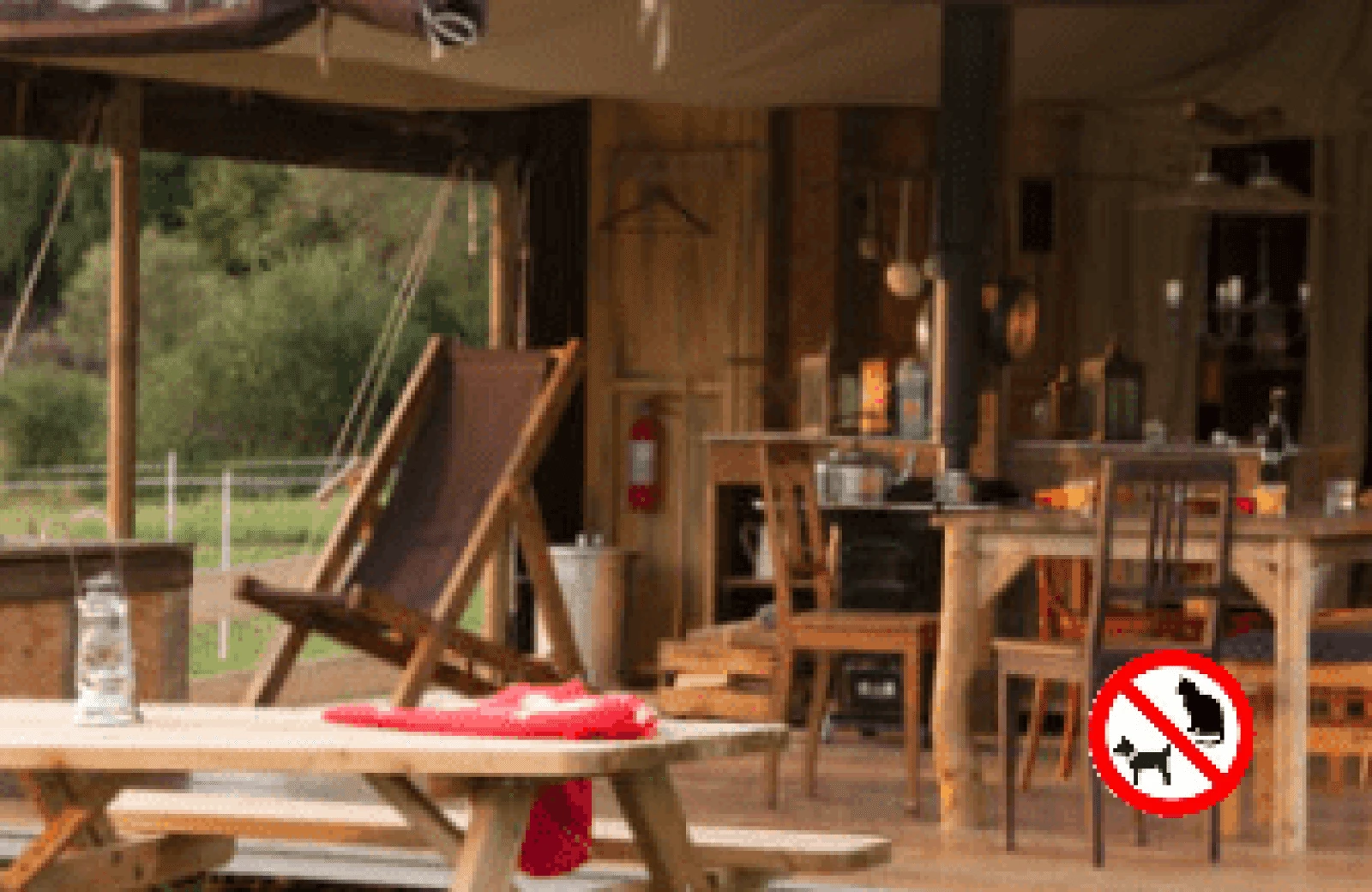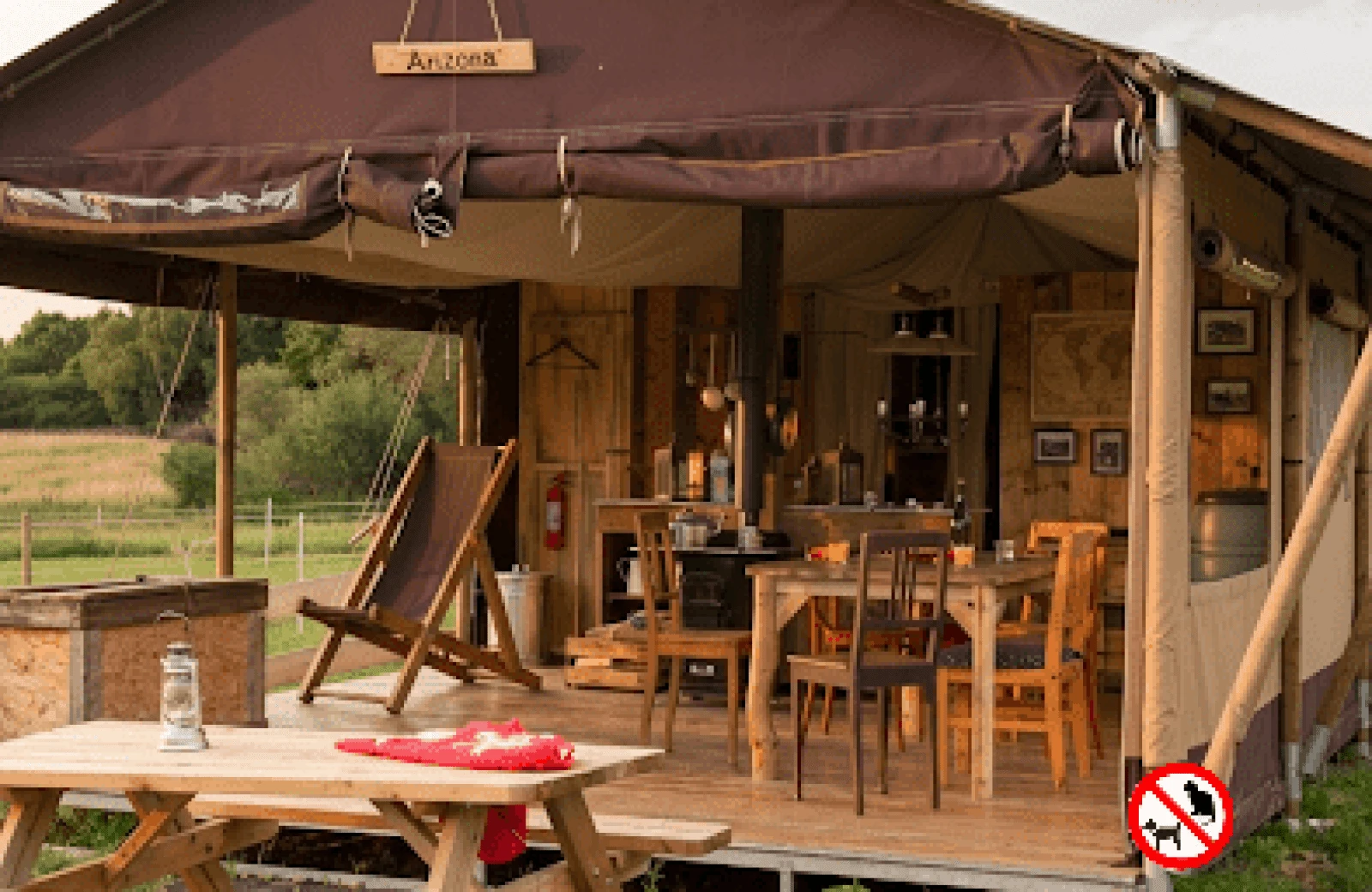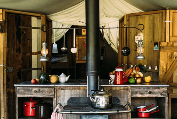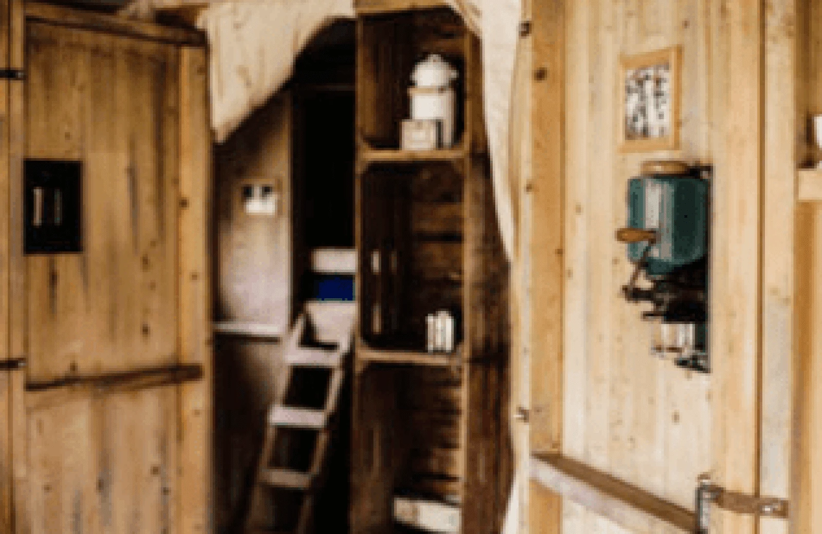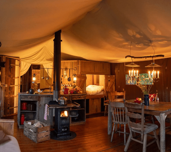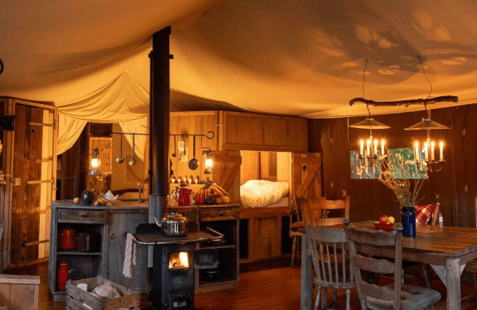 - De tent: Nostalgische inrichting met bedstee en houtkachel om te koken