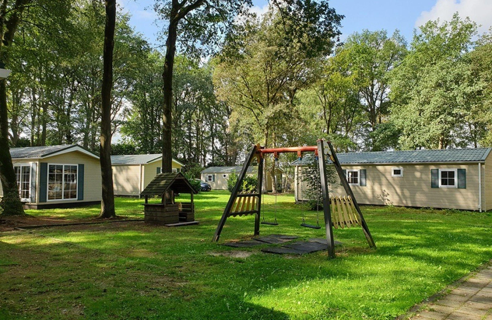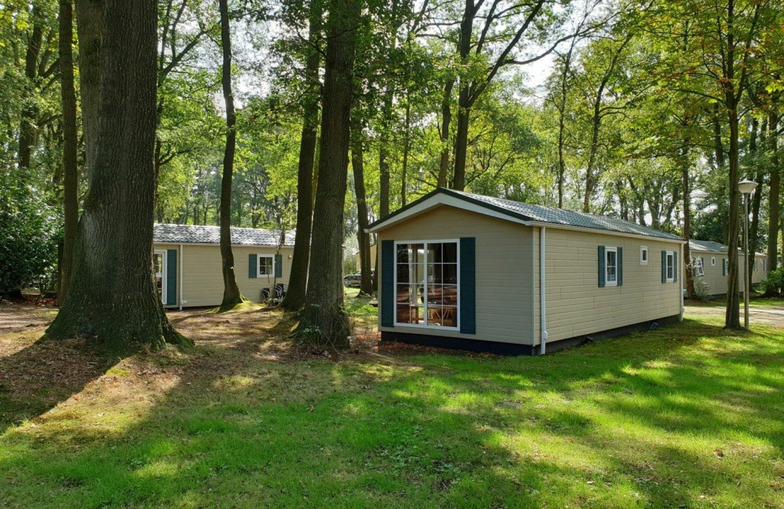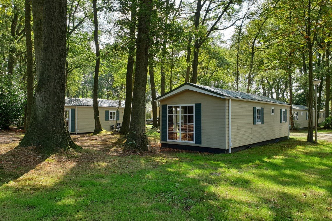 Deze 6-persoons Orlando chalet is gelegen tussen de bomen en ligt op een gezellig veldje met andere chalets.
